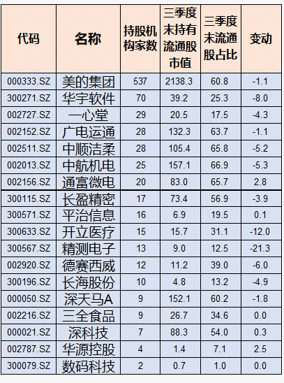 除美的集团之外,华宇软件、一心堂、广电运通、中顺洁柔、中航机电、通富微电这几只个股三季度末也被20家金融机构持有,持股比例也比较高。