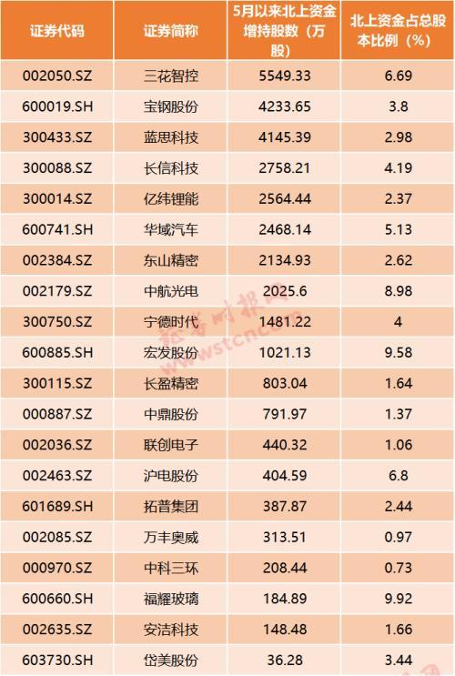 另外,证券时报记者注意到,近来,北上资金持续流入A股,对特斯拉概念尤其青睐。北上资金向来以长期价值投资、盈利能力强,投资风格稳健著称,常常被市场称为“聪明钱”,甚至在A股拥有很强的跟风效应。记者继前几日梳理了特斯拉产业链A股上市公司之后(详见:完美V型!特斯拉年内暴涨120%,国产Model 3销量太火,A股小伙伴名单请收好),又梳理了北上资金近一个月来(5月6日-6月9日)对特斯拉概念股的增持情况。记者发现,获增持数量最多的是三花智控,近一个月北上资金累计增持5549.33万股,北上资金持股占其总股本的6.69%。三花智控是新能源汽车热管理系统全球龙头供应商,最新市值为689亿元。另外,宝钢股份、蓝思科技、长信科技、亿纬锂能、华域汽车等也获得北上资金千万股以上的增持。