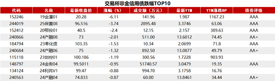 据Choice 数据统计显示,今日交易所市场非金信用债跌幅排行前五的分别是:19金灌01、25保置08、20鄂投01、24产融08、23奉化债。具体如下: