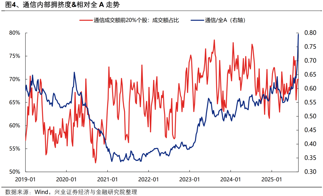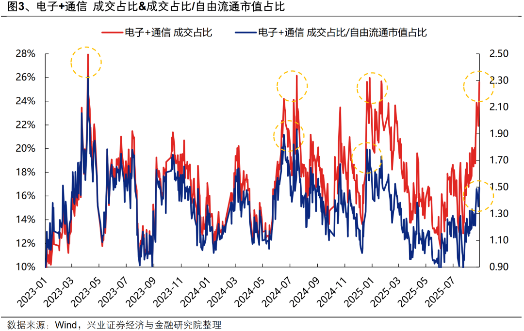 不过,考虑到近期AI行情内部的分化,单独计算电子+通信的成交占比情况。当前电子+通信成交占比25.6%,基本已达到2023年以来历轮行情的最高水平。