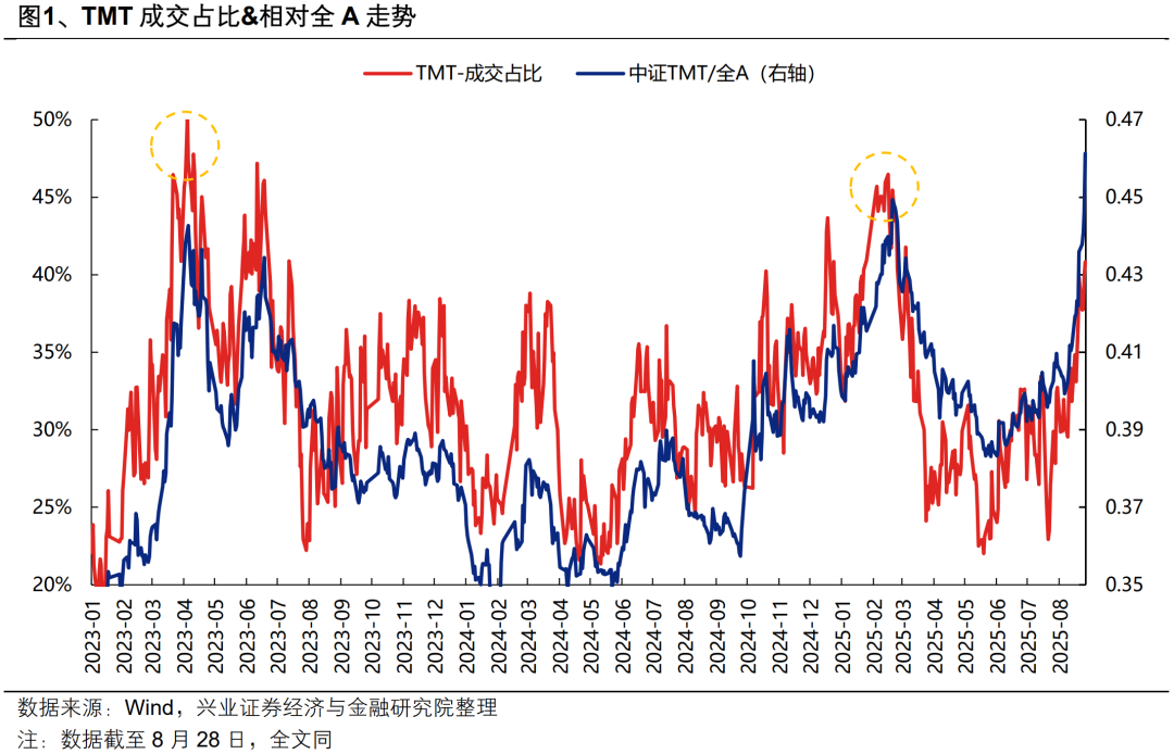 8月28日,TMT成交占比40.8%,年初Deepseek行情最高达到46.5%,2023年ChatGPT行情最高达到50.24%。