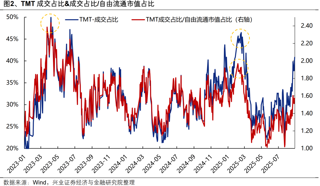 考虑到TMT市值增长,用其自由流通市值占比进行修正,计算成交占比/自由流通市值占比。当前这一指标为1.57,年初Deepseek行情最高达到1.93,2023年ChatGPT行情最高达到2.44。