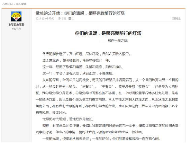 12月1日,华为CFO孟晚舟在加拿大温哥华发表了一封公开信。一年前的这一天,孟晚舟在温哥华机场被加拿大警方拘押,至今未获自由。孟晚舟在信中说,这一年,经历了恐惧和痛苦,失望和无奈,煎熬和挣扎。这一年,学会了坚强承受,从容面对,不畏未知。在信中,孟晚舟还感谢大家给她的温暖和鼓励。