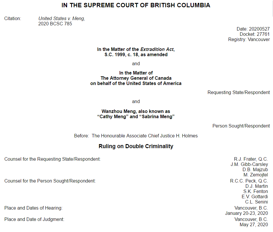 加拿大法官裁定:孟晚舟构成”双重犯罪“!这意味着孟晚舟仍然面临被引渡到美国的风险。