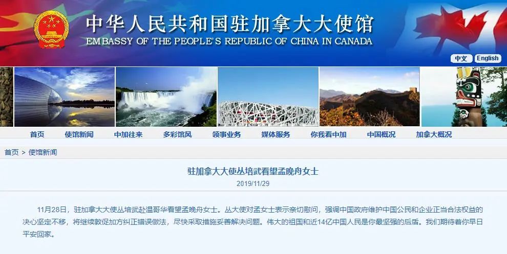 2019年的11月底,中国驻加拿大大使丛培武赴温哥华看望孟晚舟女士。丛大使对孟女士表示亲切慰问,强调中国政府维护中国公民和企业正当合法权益的决心坚定不移,将继续敦促加方纠正错误做法,尽快采取措施妥善解决问题。伟大的祖国和近14亿中国人民是你最坚强的后盾。我们期待着你早日平安回家。
