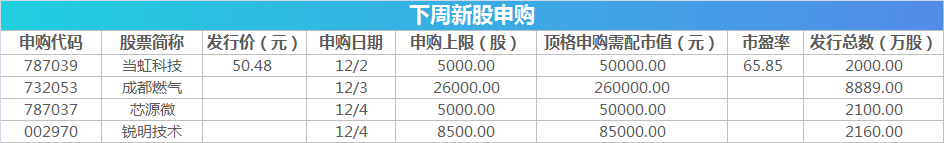 下周一共有4只新股申购,分别为锐明技术、芯源微、成都燃气、当虹科技。其中,当虹科技12月2日(下周一)进行网上申购,申购代码为787039;成都燃气12月3日(下周二)进行网上申购,申购代码为732053;锐明技术、芯源微12月4日(下周三)进行网上申购,申购代码分别为002970、787037。