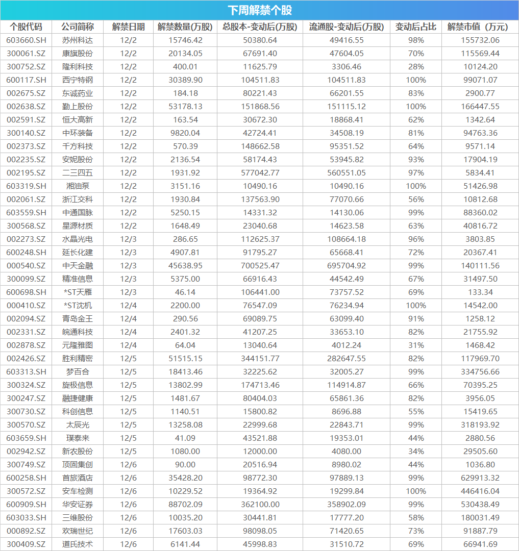 据Wind数据统计,下周(12月2日-12月6日)共有39家公司限售股陆续解禁,合计解禁量47.68亿股,按11月29日收盘价计算,解禁市值为394.54亿元,较本周解禁市值132.02亿元上升198.85%。