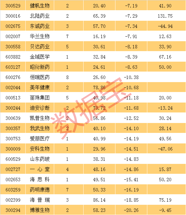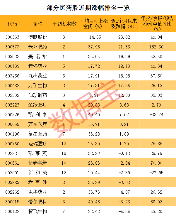 榜单中的医药股去年业绩普遍较好,24股去年净利增速或超20%。其中,兴齐眼药和北陆药业净利翻倍增长,海普瑞、长春高新、九洲药业等个股净利增速或超50%。大市值的龙头公司增速依然可观。迈瑞医疗去年净利同比增长近26%,爱尔眼科增长近37%,长春高新增长60%至80%。