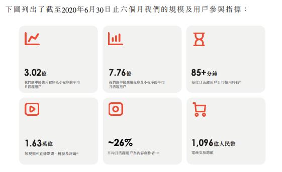 截至2020年6月30日止六个月,快手的中国应用程序及小程序的平均日活跃用户及平均月活跃用户分别为3.02亿及7.76亿。在同一期间内,日活跃用户在快手应用的日均使用时长超过85分钟、日均访问快手应用超过10次。