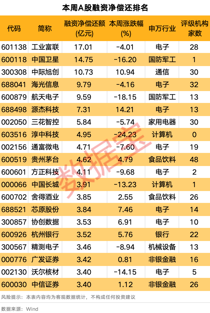 131股融资净偿还额超过1亿元。工业富联、中国卫星、中际旭创、海光信息、航天电子排名前五,融资净偿还额依次为17.01亿元、14.75亿元、10.73亿元、9.79亿元、9.59亿元;源杰科技、三花智控两股随后,融资净偿还均在5亿元以上。