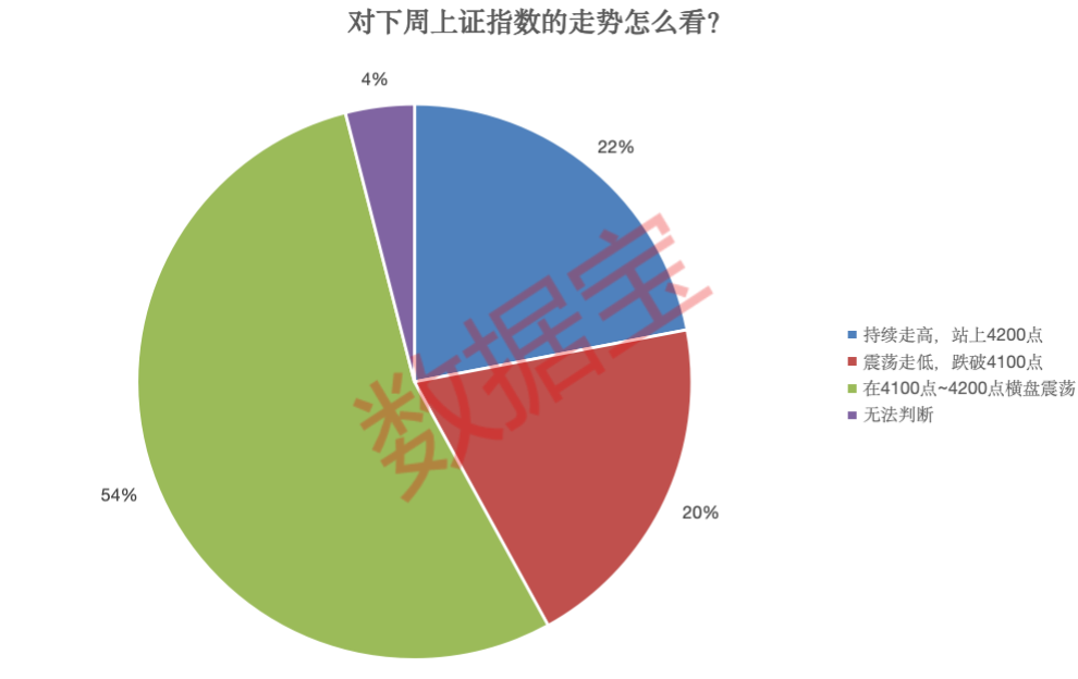 本周A股指数高位窄幅震荡,投资者对于接下来的市场走势持“中性”态度者居多。调查数据显示,54%的投资者认为下周市场将“在4100点~4200点横盘震荡”;22%的投资者认为下周市场将“持续走高,站上4200点”;20%的投资者看空市场,表示下周市场将“震荡走低,跌破4100点”。