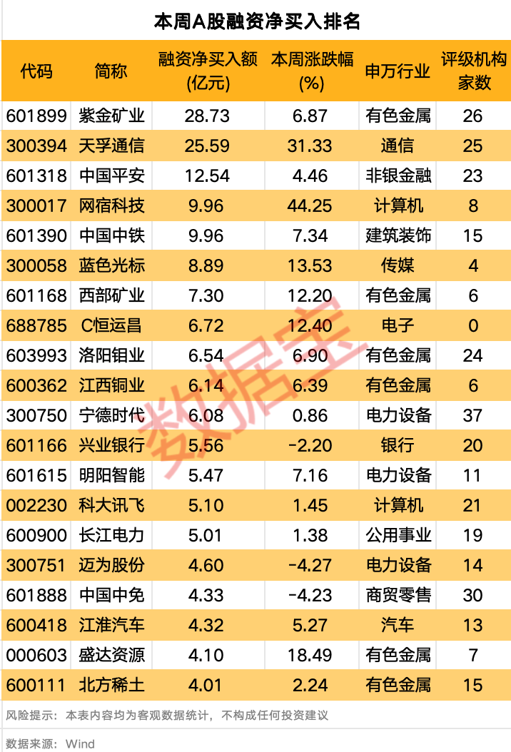 个股方面,本周31股融资净买入额在3亿元以上,紫金矿业、天孚通信、中国平安排名前三,融资净买入额依次为28.73亿元、25.59亿元、12.54亿元。
