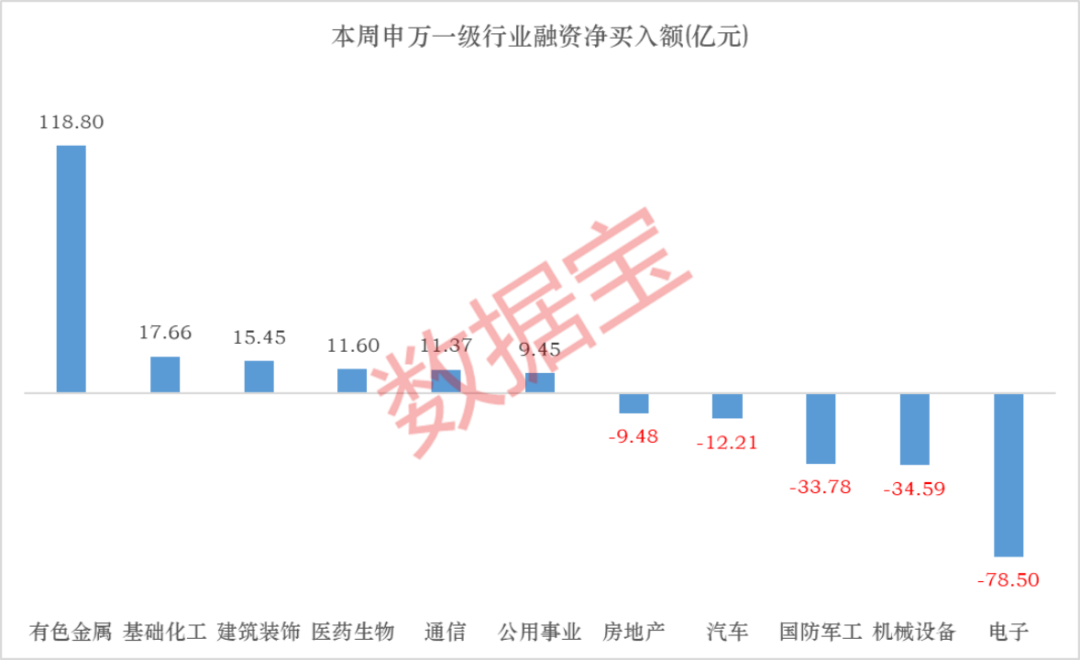 分行业来看,有色金属遥遥领先,融资净买入额高达118.8亿元;基础化工、建筑装饰、医药生物、通信融资净买入额超过10亿元。电子遭到融资大额净偿还,金额为78.5亿元;机械设备、国防军工紧随其后,融资净偿还额均在30亿元以上。