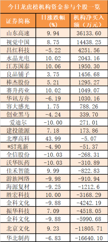 盘后龙虎榜数据显示,机构现身26股,其中山东高速等14只股票呈现机构资金净买入,华北制药等12股呈现机构资金净卖出。