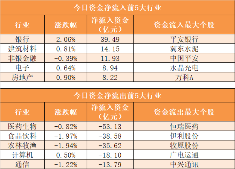 28个申万一级行业中,10个行业实现资金净流入,其中银行业净流入39.49亿元居首。