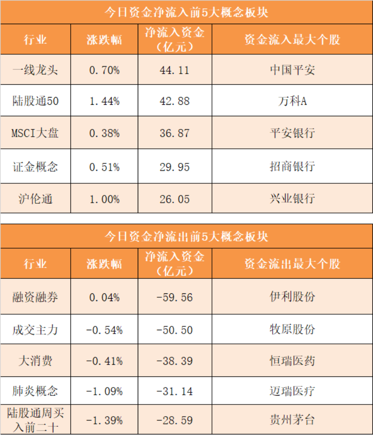 概念板块方面,今日一线龙头、陆股通50、MSCI大盘、证金等概念板块资金呈现净流入,其中一线龙头概念净流入44.11亿元居首。
