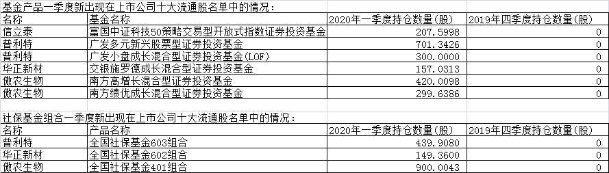 上证报数据显示,以当前披露数据来看,一季度社保基金、公募基金步调一致:两者均新晋升为普利特、华正新材、傲农生物3只个股的十大流通股股东。尽管富国基金旗下一只ETF基金还新入驻了信立泰,不过,由于该基金为被动型基金,暂且不作为参考。