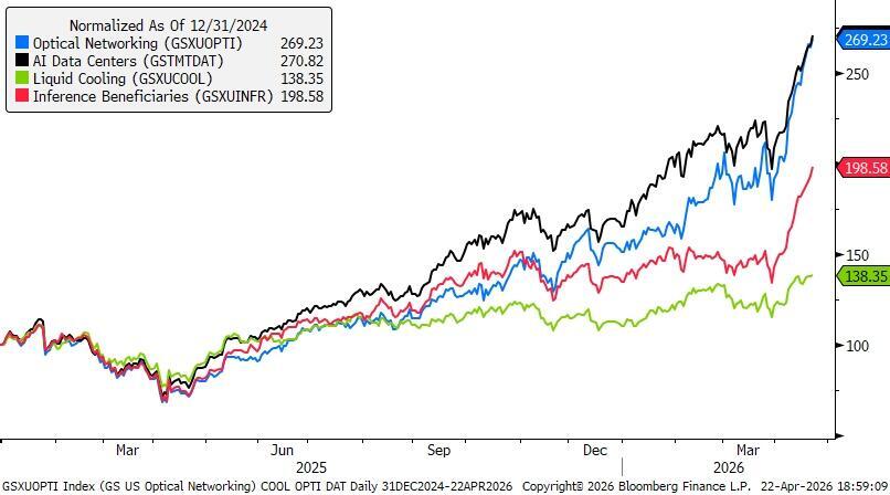 过去几周,美股最强的一条线,还是 AI。标普五百指数和纳斯达克指数自低点分别反弹约 11% 和 18%,资金重新回流科技、数据中心和相关基础设施。