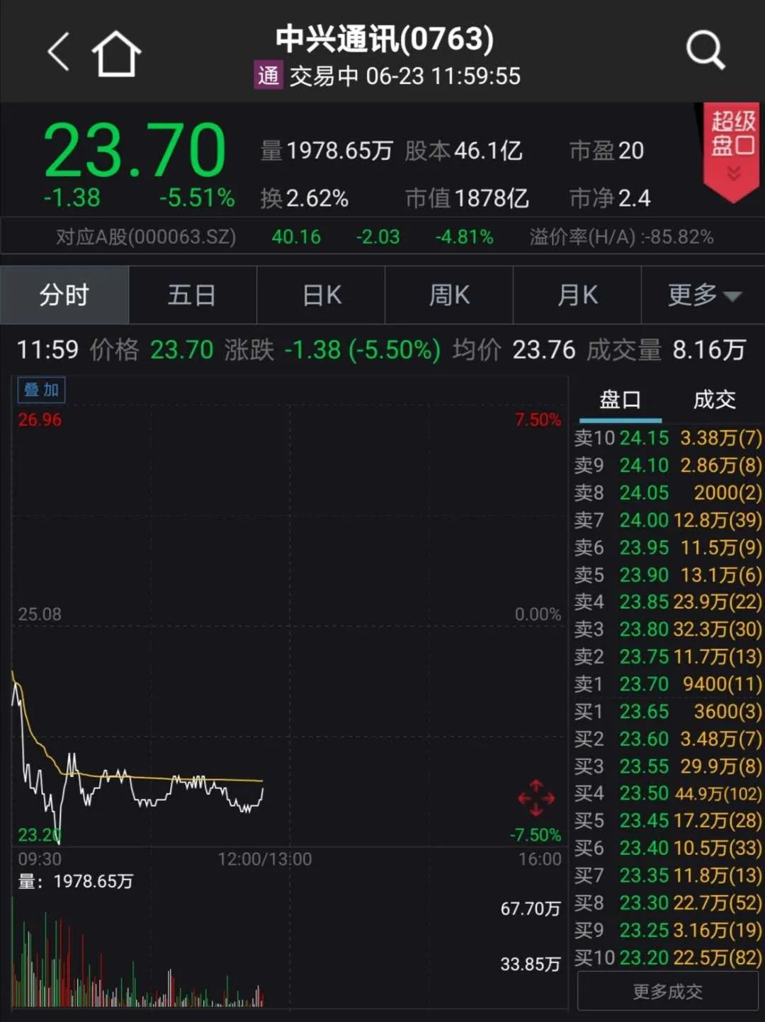 6月23日开盘,中兴通讯AH股低开低走,双双大跌。截至午间,A股报收每股40.16元,下跌4.81%;H股报收23.7元,下跌5.51%。粗略推算,中兴通讯半日市值蒸发近百亿元。