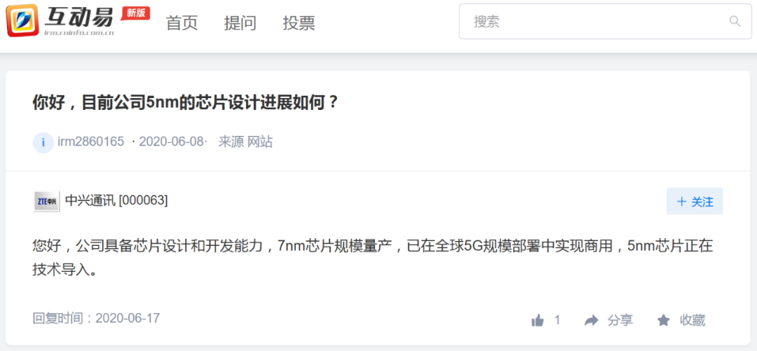 6月17日,中兴通讯在深交所互动易平台上回复投资者提问时再度表示,7nm芯片已在全球5G规模部署中实现商用,5nm芯片正在技术导入。