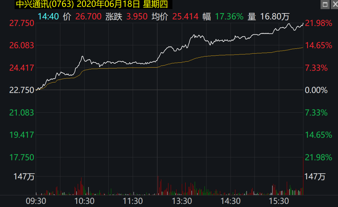 受上述消息刺激,6月18日,中兴通讯AH股双双大涨。其中,A股收盘大涨6.62%。H股单日涨幅更是接近22%。