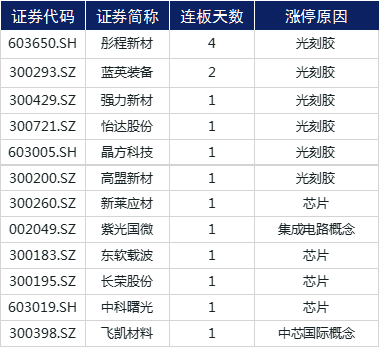 市场风格轮动加快,科技股今日集体活跃,光刻胶、芯片、国产软件、云计算、集成电路等板块掀起涨停潮。彤程新材(603650.SH)实现4连板,蓝英装备(300293.SZ)实现2连板,强力新材(300429.SZ)、怡达股份(300721.SZ)、晶方科技(603005.SH)、高盟新材(300200.SZ)、新莱应材(300260.SZ)、紫光国微(002049.SZ)、东软载波(300183.SZ)、长荣股份(300195.SZ)、中科曙光(603019.SH)、飞凯材料(300398.SZ)等涨停。