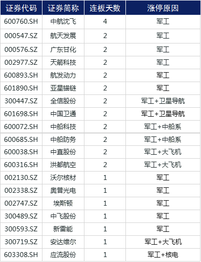 在资金追捧下,国防军工板块再度延续昨日的强劲势头。中航沈飞(600760.SH)实现4连板,航天发展(000547.SZ)、广东甘化(000576.SZ)、天箭科技(002977.SZ)、航发动力(600893.SH)、亚星锚链(601890.SH)、全信股份(300447.SZ)、中国卫通(601698.SH)、中船科技(600072.SH)、中船防务(600685.SH)、中直股份(600038.SH)、洪都航空(600316.SH)实现2连板,沃尔核材(002130.SZ)、奥普光电(002338.SZ)等纷纷涨停。
