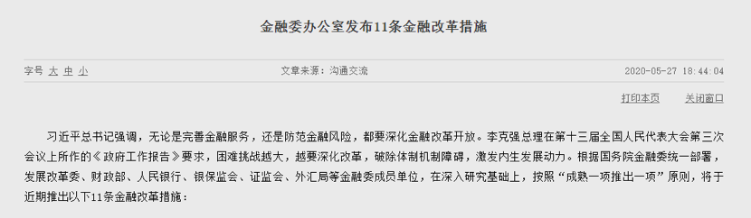 央行网站消息,国务院金融稳定发展委员会办公室27日表示,根据国务院金融委统一部署,发展改革委、财政部、人民银行、银保监会、证监会、外汇局等金融委成员单位,在深入研究基础上,按照“成熟一项推出一项”原则,将于近期推出11条金融改革措施。