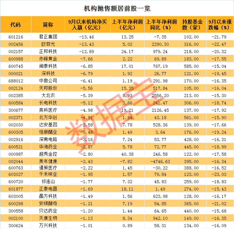从机构抛售情况来看,9月以来股价下跌超15%的这53股中,机构资金连续3个交易日呈现净卖出的有33只股,连续5个交易日净卖出的有19股,自9月以来7个交易日全部呈现机构净卖出状态的有11股。君正集团的机构净卖出额最大,净卖出13.46亿元,该股今年因蚂蚁概念已经上涨164.87%,最新收盘价较年内高点回撤35.56%,公司上半年净利润13.25亿元,同比下降7.36%。