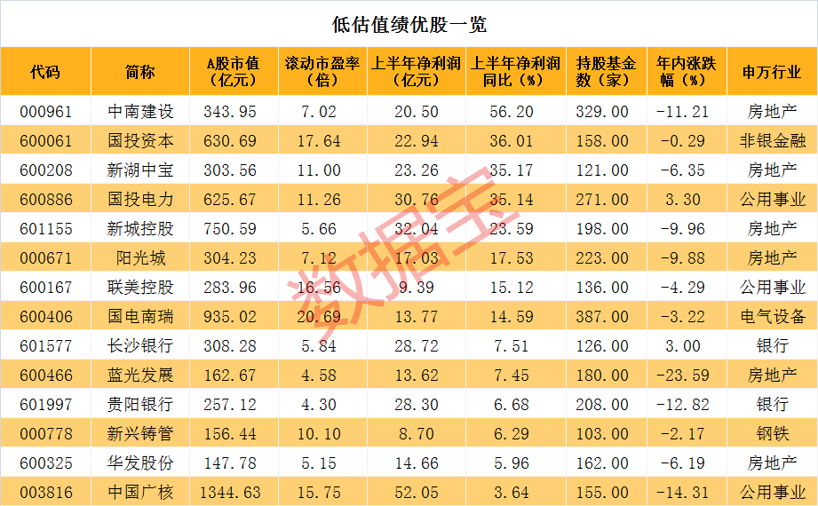 数据宝梳理了整个A股的数据发现,兼具基金重仓、低估值、股价滞涨、业绩绩优和最新收盘价相对低等特点的A股共有14只。其中房地产板块中南建设上半年净利润达到20.5亿元,同比增长56.2%,增幅最大。同样是房地产股的阳光城昨日获主力资金净流入近1.32亿元。