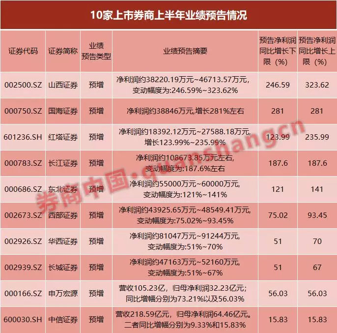 亮眼的业绩表现,无疑是上涨的重要支撑。14日晚间,申万宏源、山西证券、长江证券披露上半年业绩预告,至此已有10家上市券商公布上半年业绩。不论是否存在计提资产减值准备,各家券商上半年净利润都同比增幅明显,除了中信证券外,其余券商净利润同比增幅50%起步,多家券商数倍增长。