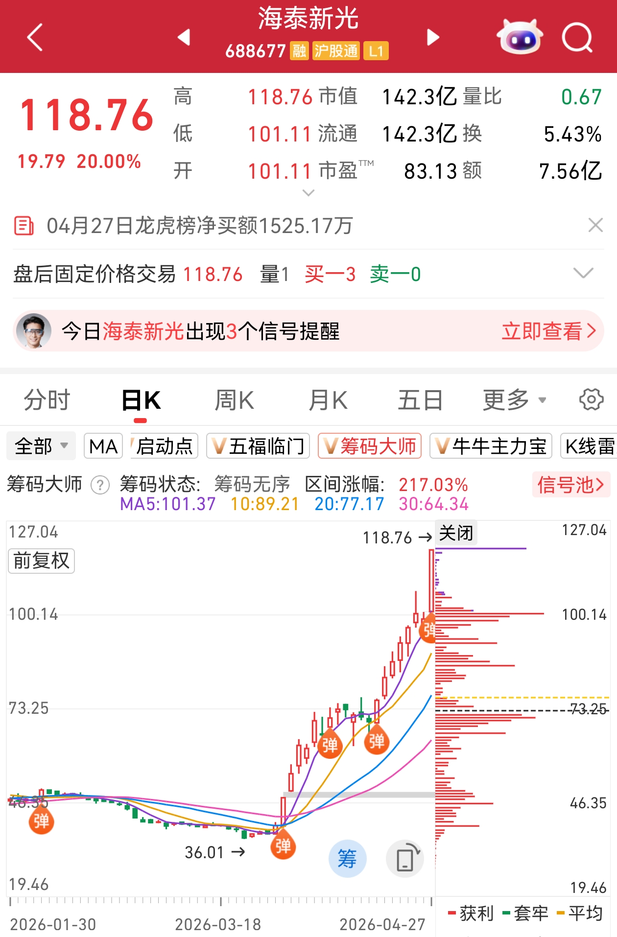 注:主升浪也并非完全无迹可寻!“筹码大师”显示,海泰新光前期连续密集出现“突”、“弹”信号,短短一个多月时间里,合计出现5次“弹”信号,最后一次出现是在4月16日,随后拉出一波无敌8连板,并在今天实现20厘米涨停!那么,你的股有没有强势信号出现?还有哪些股出现了强势信号呢?更多学习案例参考,尽在“筹码大师”!点击详情>>