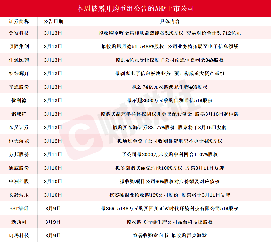 据财联社不完全统计,截至发稿,本周披露并购重组进展的A股上市公司共有16家,包括金富科技、顶固集创、仟源医药、经纬辉开、亨通股份、优利德、锴威特、东吴证券、恒天海龙、方邦股份、通威股份、中洲控股、长龄液压、*ST清研、新劲刚、珂玛科技,具体情况如下图: