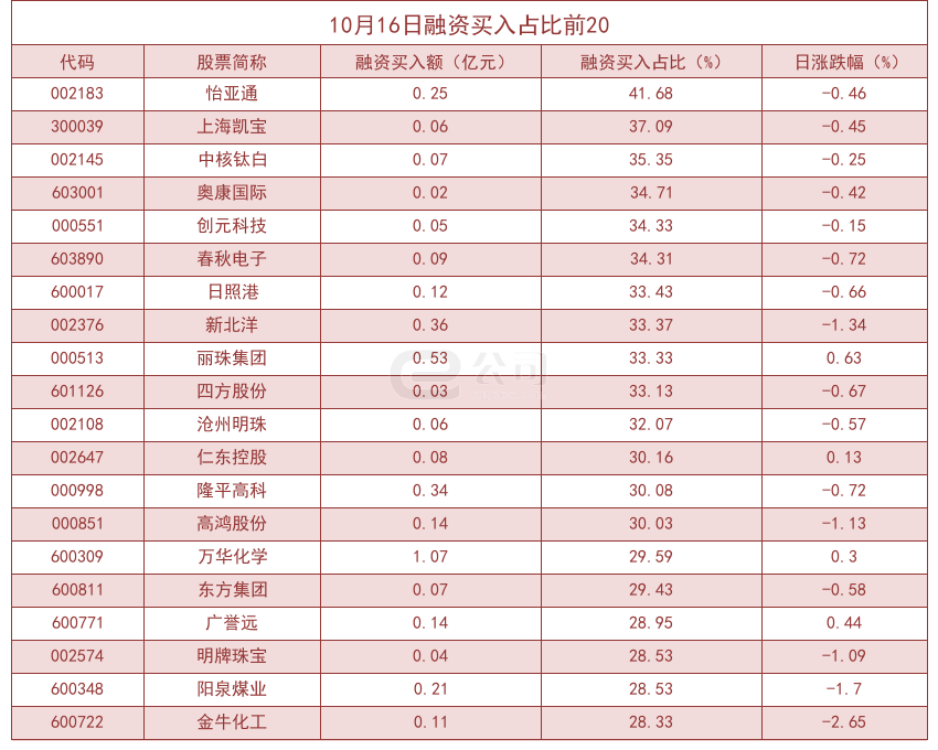 个股方面,沪深两市共有1597只个股有融资资金买入。从融资买入额占当日总成交金额比重来看,共有109只股票融资买入额占比超20%,其中怡亚通(41.68%)、上海凯宝(37.09%)、中核钛白(35.35%)排名前三。
