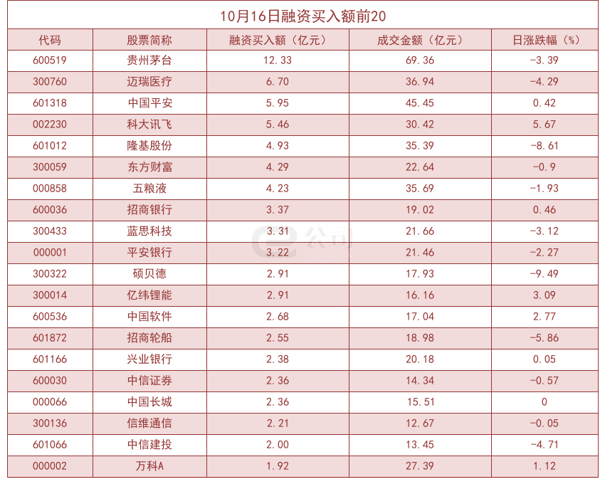 从融资资金买入金额来看,共有59只个股买入金额超亿元,其中贵州茅台(12.33亿元)、迈瑞医疗(6.70亿元)、中国平安(5.95亿元)居前三位。