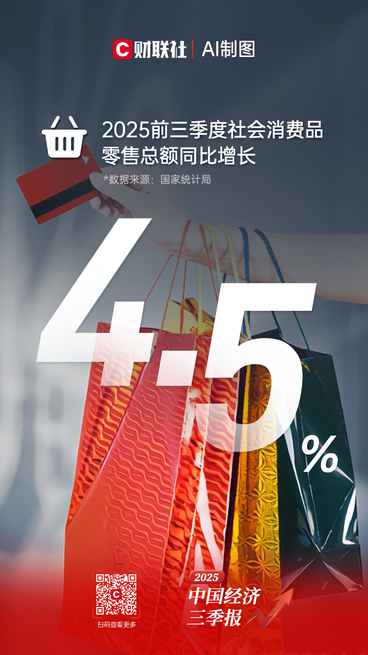社会消费品零售总额:前三季度,社会消费品零售总额365877亿元,同比增长4.5%。其中,9月份同比增长3.0%。