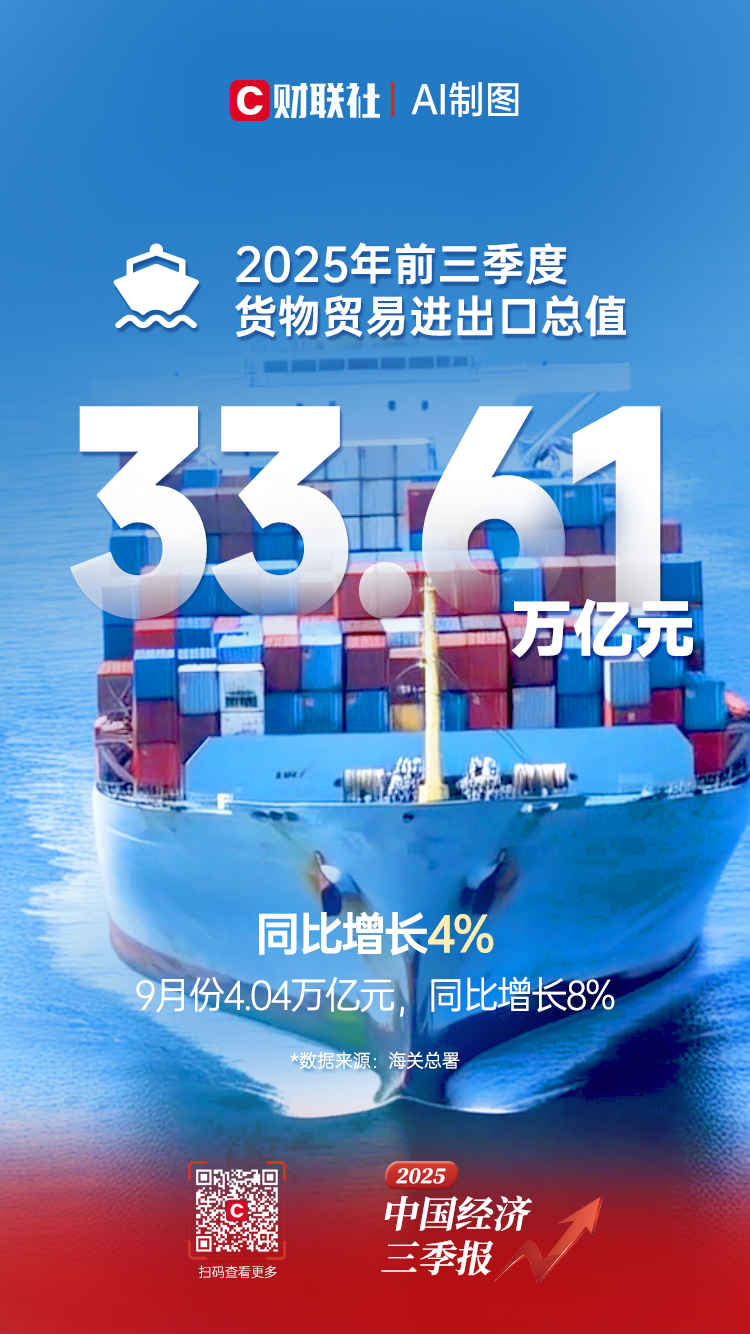 进出口:前三季度,货物进出口总额33.61万亿元,同比增长4%。其中,9月份进出口总额4.04万亿元,同比增长8%。