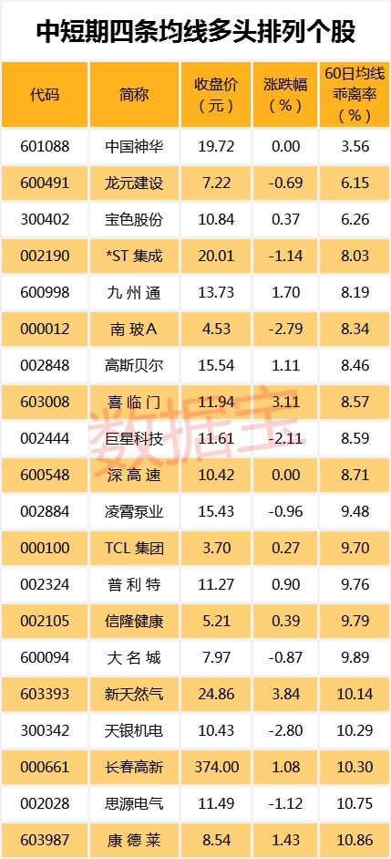 一般来说,均线多头排列代表买方力量强大,后市由多方主导行情概率较大。107只个股5日、10日、20日、60日四条均线近日呈多头排列。其中中国神华、龙元建设、宝色股份股价与60日均线的乖离率最小,分别为3.56%、6.15%、6.26%。