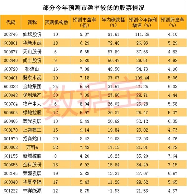 从预测市盈率角度来看,最低的是荣盛发展,19家机构一致预测该股市盈率为3.88倍榜单最低。新城控股预测市盈率位居次席,8家机构一致预测市盈率为4.2倍。此外,华夏幸福、蓝光发展、金地集团、绿地控股等个股预测市盈率均不足6倍。