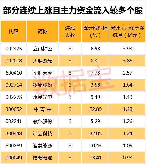 值得注意的是,144只连续上涨个股中,9只个股期间主力资金累计净流入超过亿元。其中,累计资金流入最多的为立讯精密,主力资金累计流入3.93亿元。