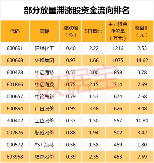 值得注意的是,39只放量滞涨股中,阳煤化工、尖峰集团、中远海特、中远海发、中钨高新等个股主力资金净流入较多。