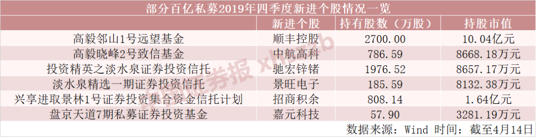 此外,高毅邻山1号远望基金在2019年四季度新进顺丰控股,持有2700万股,占其总股本的比例为0.61%,位列其第八大流通股东,持股市值达10.04亿元;同时也增持了三七互娱321.99万股,总持股数量达5182.00万股,持股市值达13.96亿元,丽珠集团也被增持150万股,总持股数量3150万股,持股市值达10.62亿元。此外,高毅旗下另一只产品高毅晓峰2号致信基金则新进中航高科,持有786.59万股,占总股本的0.56%,持有市值达8668.18万元。