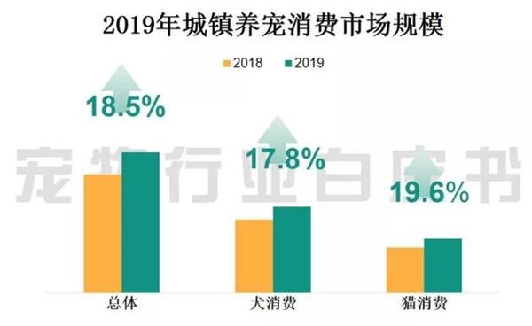 根据《2019年中国宠物行业白皮书》数据显示,2019年中国城镇宠物(犬猫)消费市场突破2000亿的关卡,整体消费规模达到2024亿元,比2018年增长18.5%。