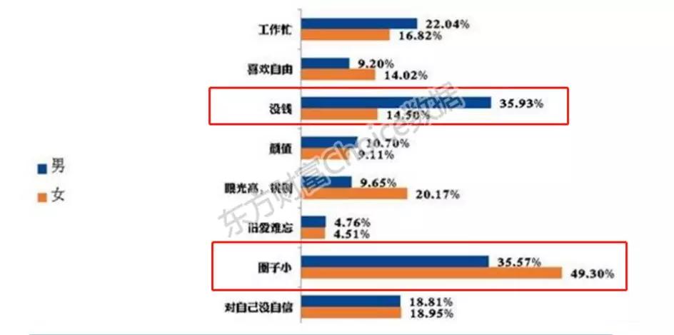 另一方面,陌生人社会也导致圈子小,不利于顺利脱单成为女生主要的单身原因。