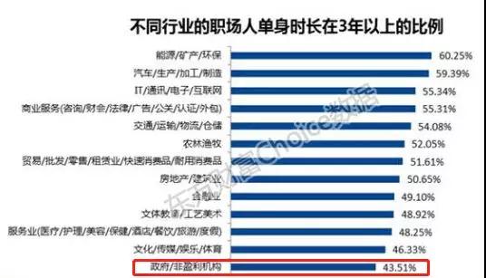 而政府/非盈利机构单身率最低,占比43.51%,看来“吃皇粮”的职场人真的是最好找对象的。