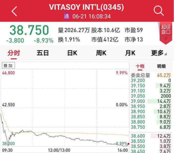 21日,维他奶国际(00345HK)早盘大幅跳水,一度跌近10%。截至收盘,跌8.93%,报38.75港元,成交额7.99亿港元。