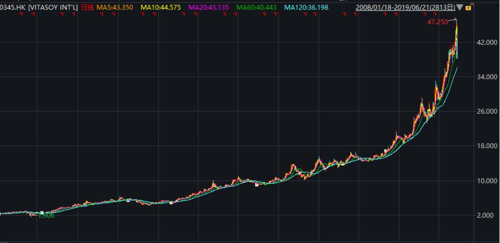 香港市场上一枝独秀的维他奶国际(00345HK)创造了10年间股价翻了10倍的神话,PE高达60倍却一直创新高。A股市场的贵州茅台虽然也是穿越牛熊的价值投资重仓股,但是PE却只有30倍左右,而A股唯一能与维他奶国际一争高下的只有卖酱油起家的海天味业,PE60倍左右,股价早已冲破100元大关。