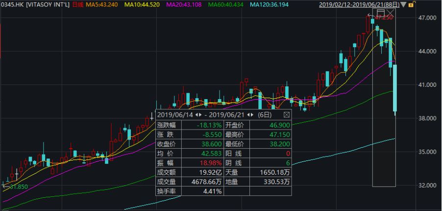 而此前,维他奶国际连续6个交易日创历史新高,在13日报收47.15港元,涨2.74%。今年以来累计涨幅约57%,总市值497.56亿港元。随后14日开始,维他奶国际连续6个交易日下跌,21日更是一举跌破60日均线,连日来跌幅约18.13%,振幅18.98%,总市值蒸发近80亿港元。