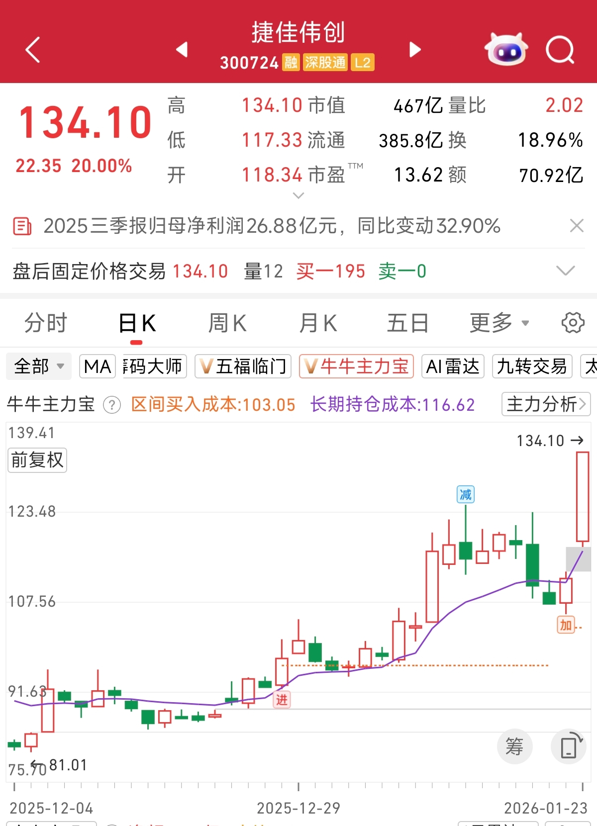 根据“主力宝”监控,今日大涨的捷佳伟创,12月26日出现了主力进场信号,12月22日出现了加仓信号。