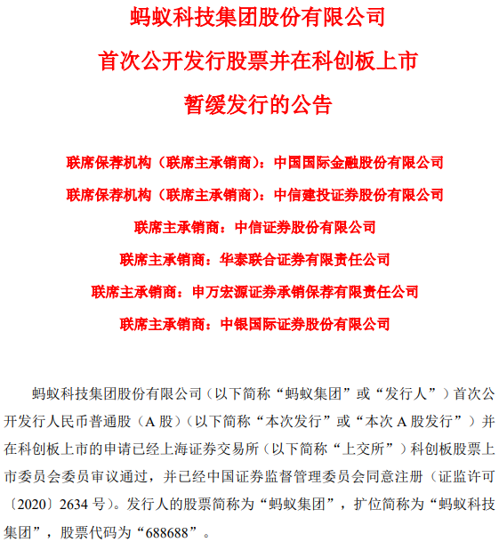 2020年11月5日,蚂蚁集团发布A股暂缓发行相关事项的公告,依据公告披露,经与主承销商协商,蚂蚁集团决定暂缓本次发行程序并同步披露了相关退款安排,及时返还冻结申购资金并加算同期银行存款利息。同时公司披露,依据科创板首次公开发行注册管理相关规定,在注册决定的一年有效期内,公司将根据对重大事项影响的评估和核查情况,视情况决定是否重新启动发行程序。